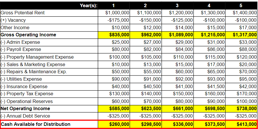 The most important line in the proforma for return analysis is Cash Available for Distribution. This figure represents the cash remaining after operating expenses and debt service and forms the basis for estimating total cash received by investors.